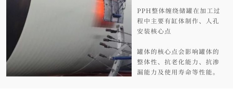 工藝對比:PPH整體纏繞臥式儲罐是PPH顆粒料混合母料直接加工成型,不存在二次加工,而傳統上是顆粒料加工成板材,之后板材再加工成罐體。PPH整體纏繞儲罐不存在接縫、焊縫問題,不存在滲漏,且因不用倒角焊接,整體機械強度遠遠大于傳統加工的儲罐。